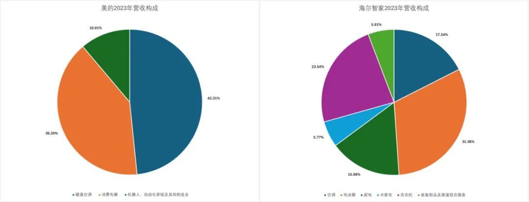 去年,美的营收中36.20%来自消费电器(洗衣机、冰箱、厨电及其他家电等),另有10.01%营收来自机器人、自动化系统及其他制造业;而海尔智家的电冰箱、洗衣机、厨电产品营收占比分别为31.36%、23.54%、15.98%。