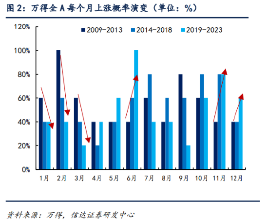 通过统计万得全A指数从2008-2024年每个月的涨跌幅情况,可以发现2月、7月、11月是市场上涨概率较高的月份,基本上对应了3月两会、7月政治局会议、10月N中全会,大多是重要政策的变化之际。